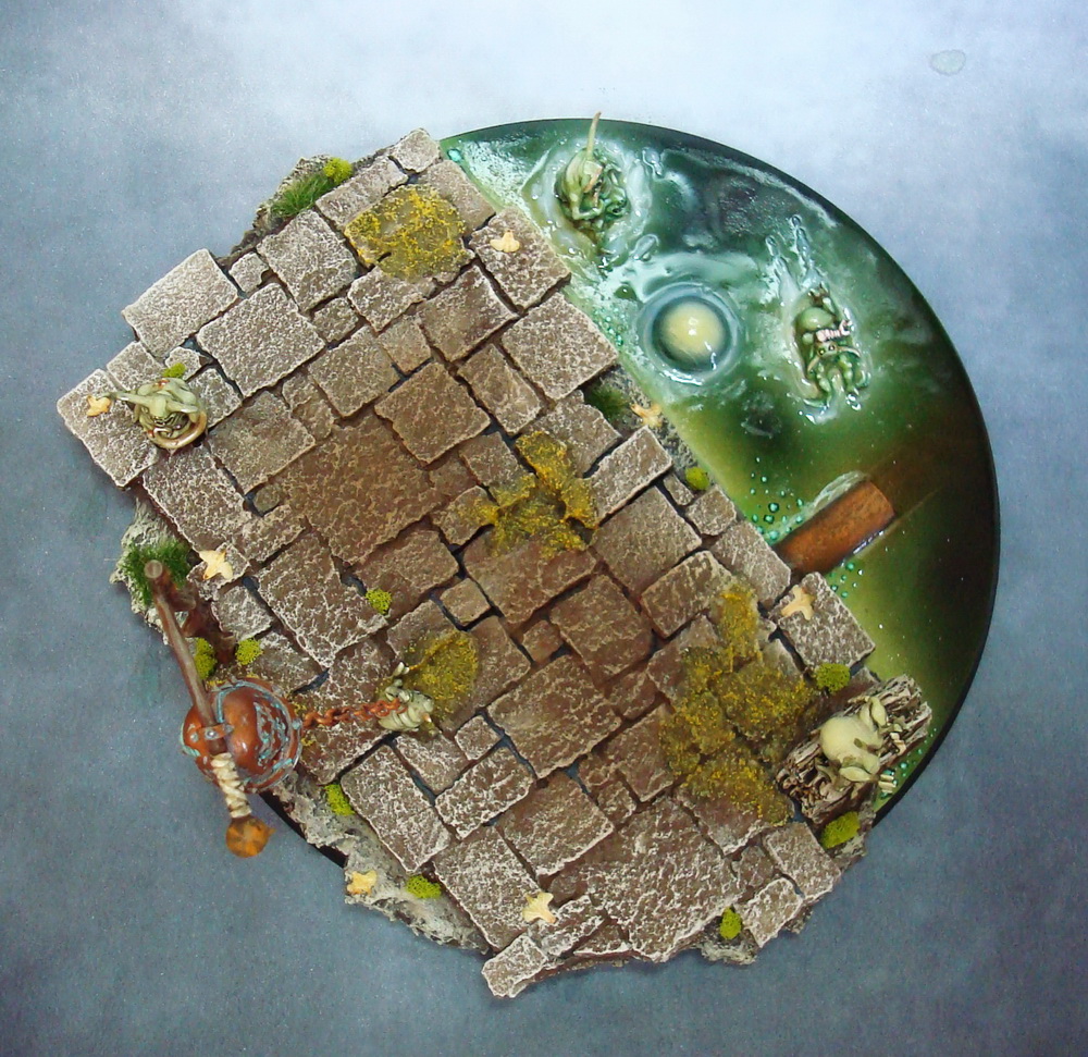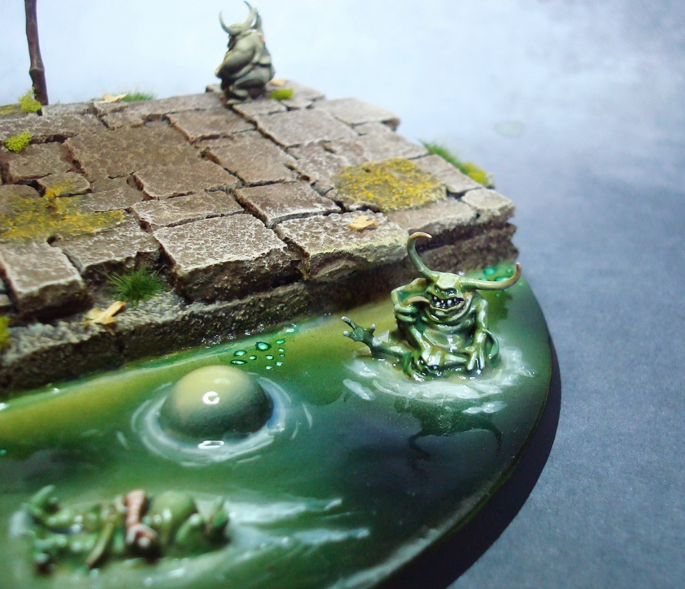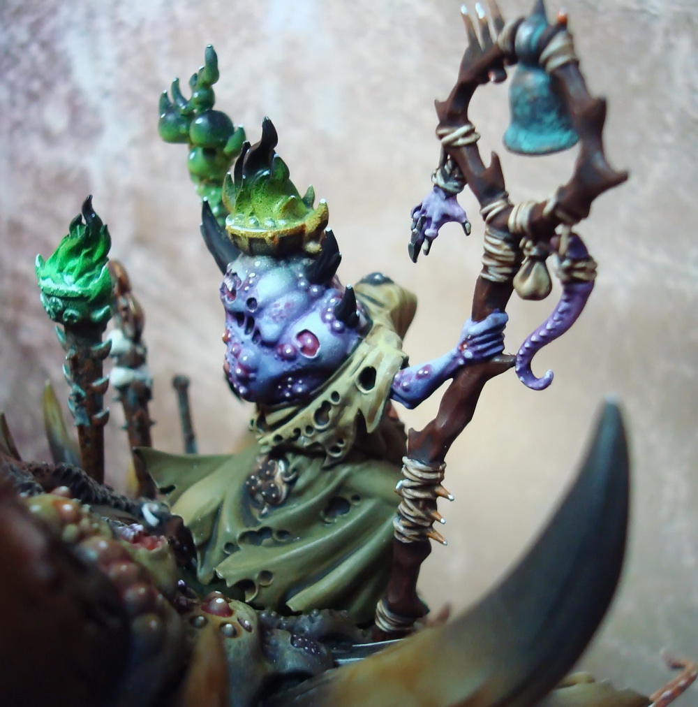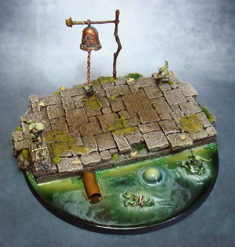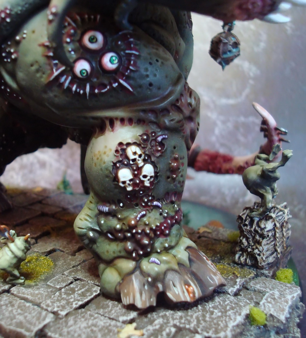 Le socle est une base de 130mm agrémenté de divers moulage en plâtre perso et quelques nurglings qui s’amusent bien ^^.