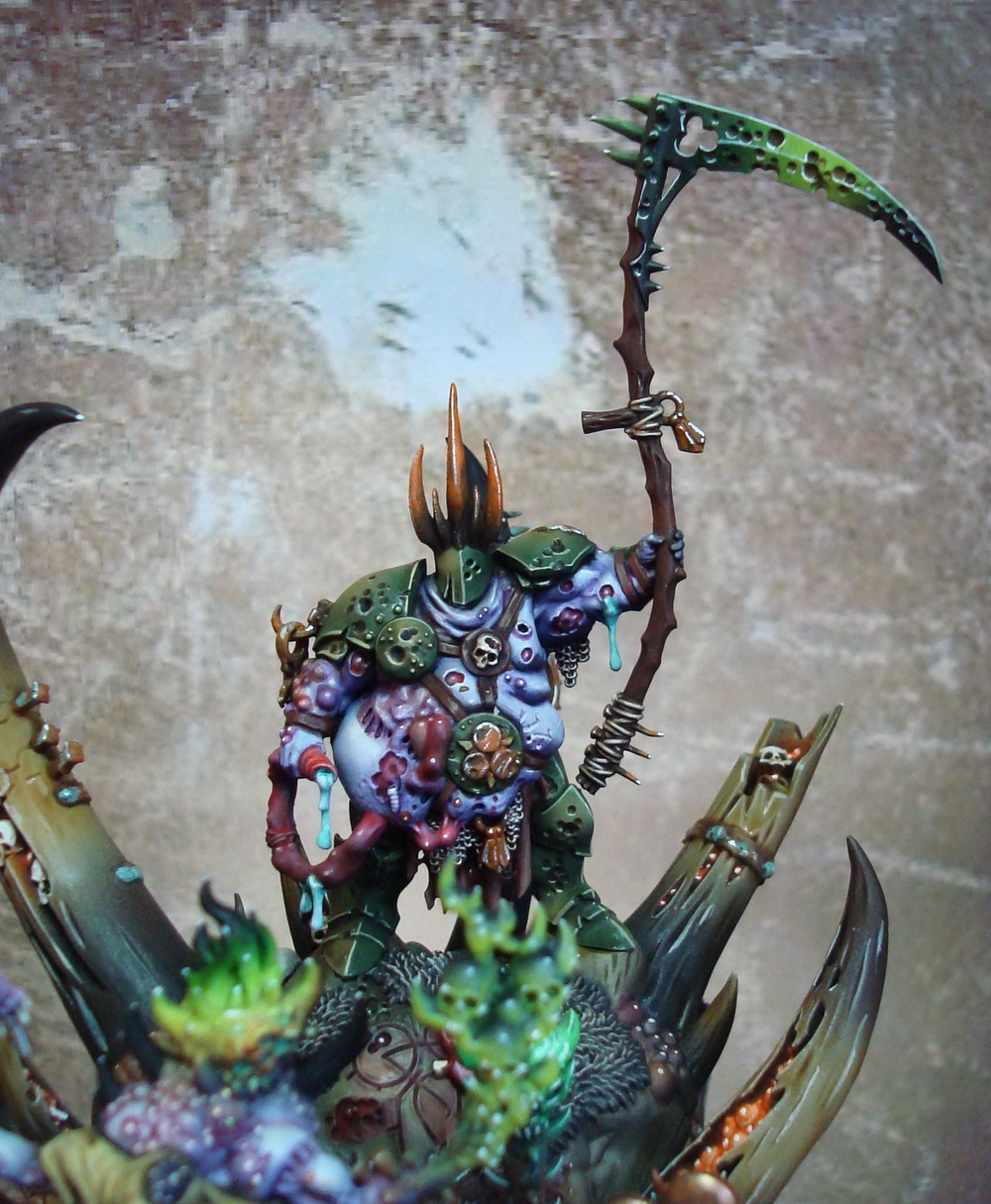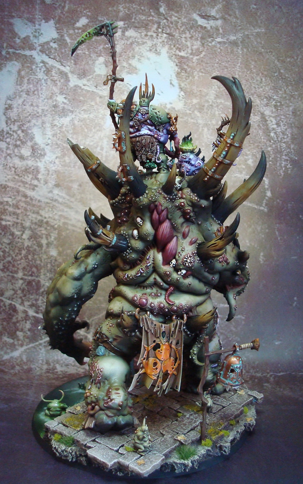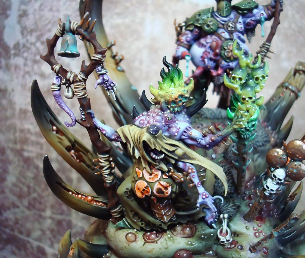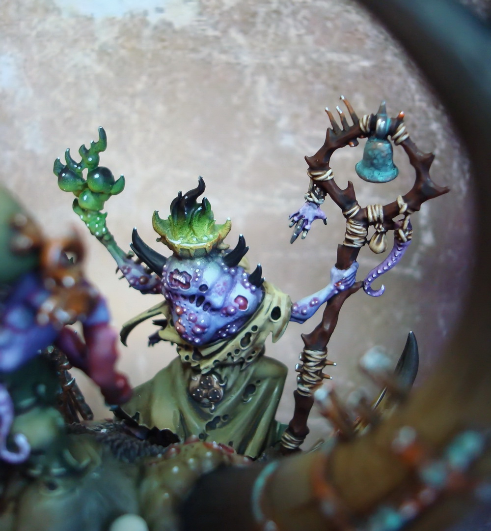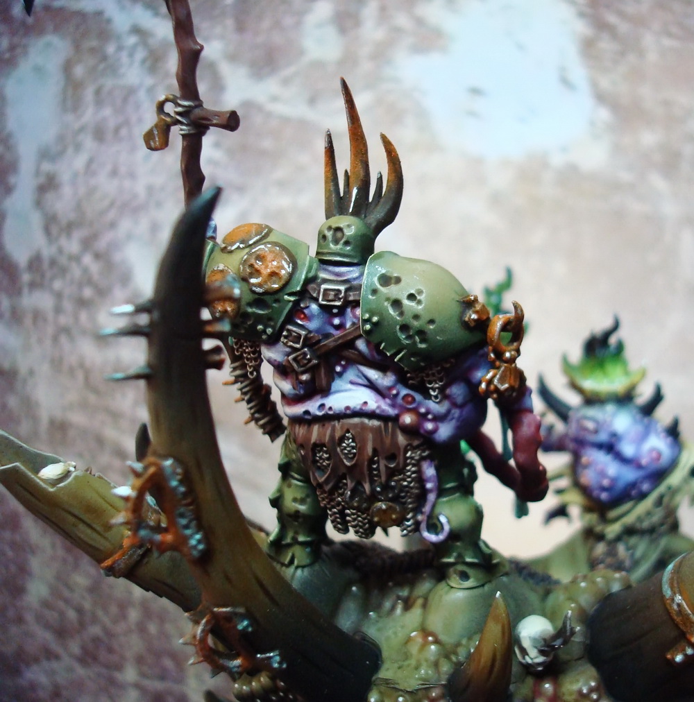 Le socle est une base de 130mm agrémenté de divers moulage en plâtre perso et quelques nurglings qui s’amusent bien ^^.