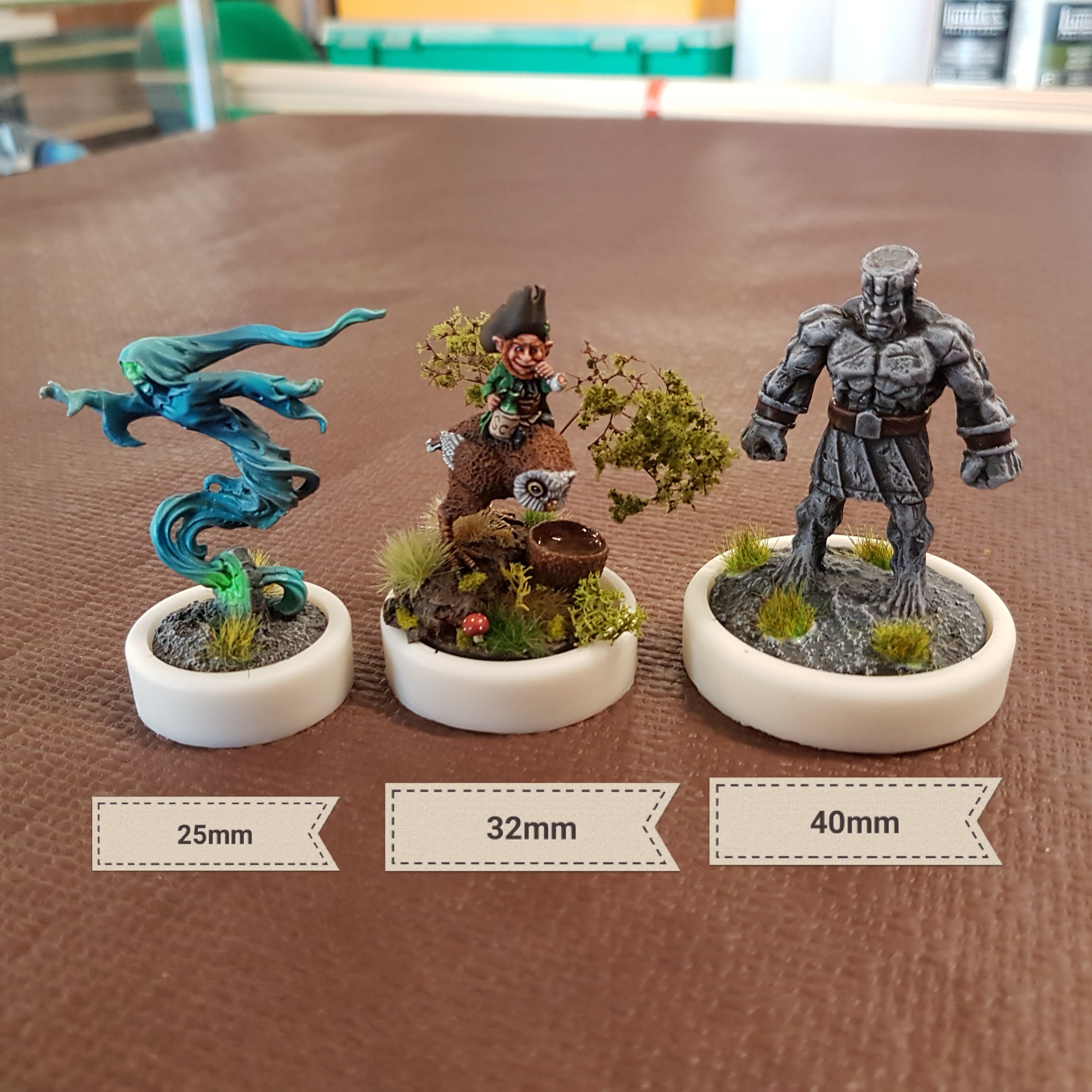 J’ai modélisé deux séries de « displays » en 3D pour figurines 28mm/32mm au socles ronds (25mm, 32mm et 40mm pour le moment). Une série de 10mm de haut, et une autre de 20mm.