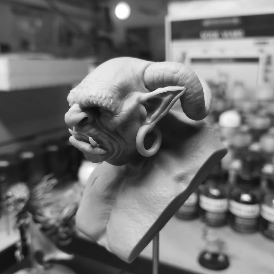 Je voulait obtenir un bon gros faciès renfrogné avec un nez bien charnue et les orbites très enfoncés sous des arcades sourcilières épaisses. Après cela, je me suis attaqué au cornes incurvées que j’ai texturé pour imité des cornes de bélier.