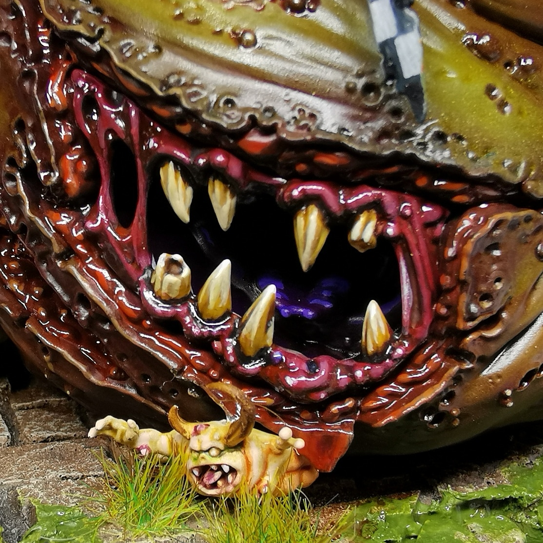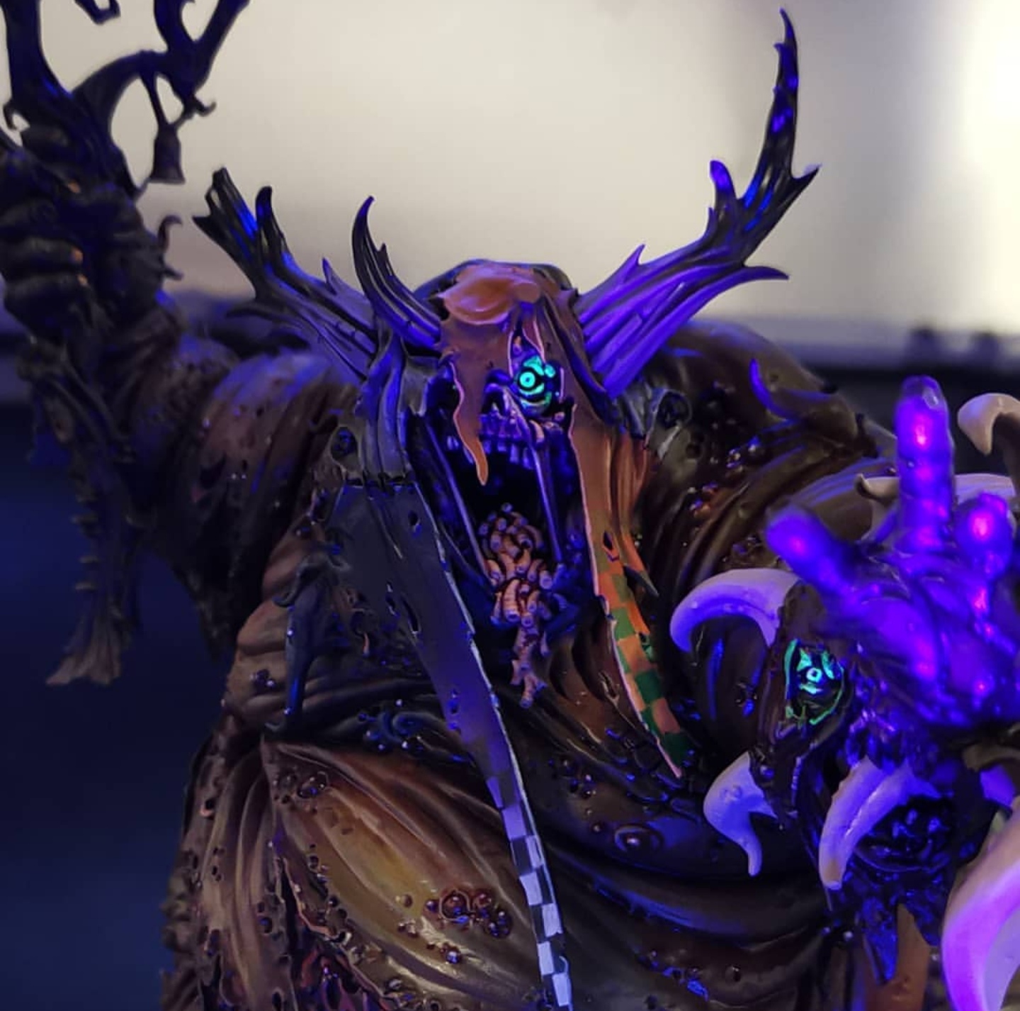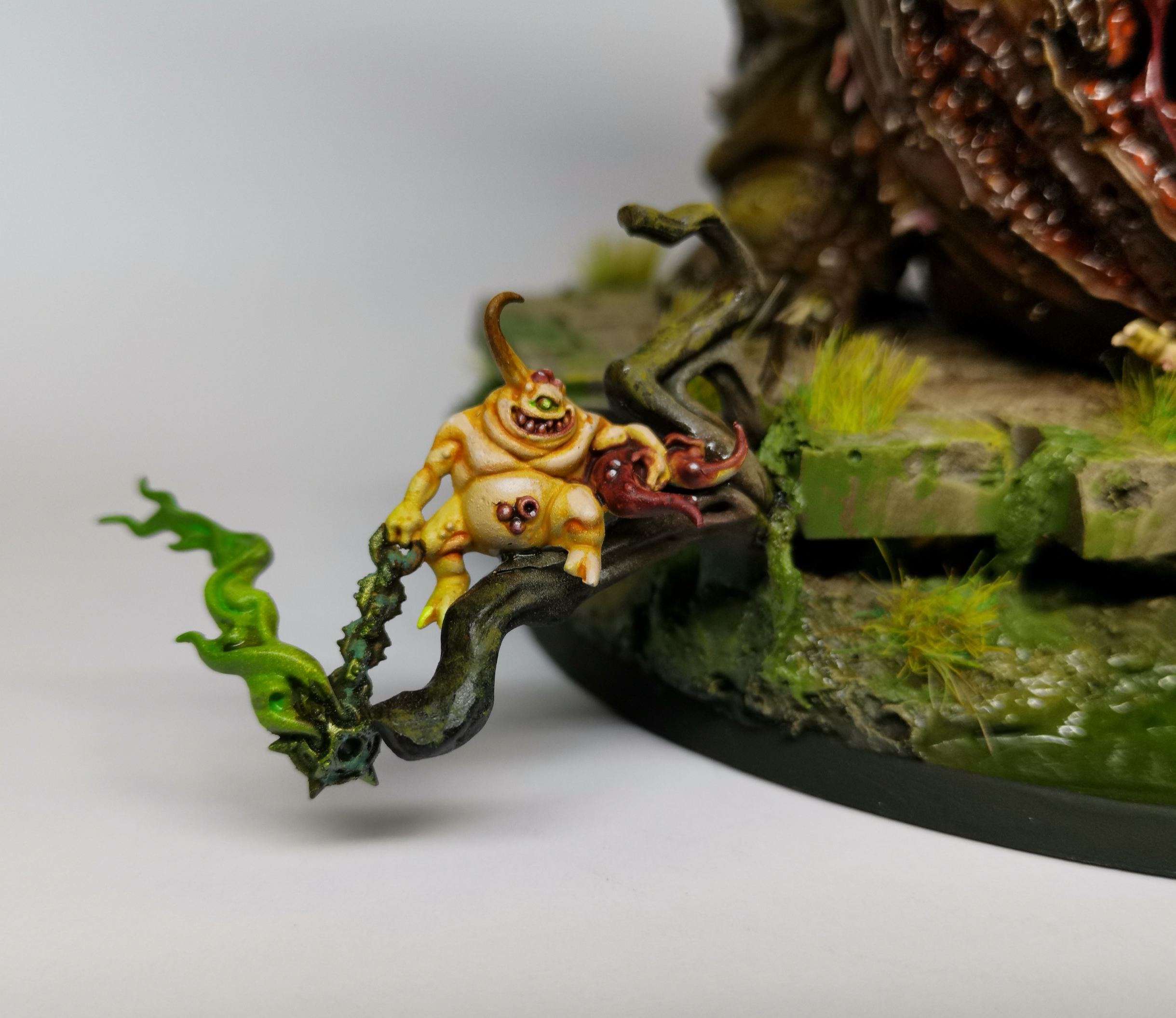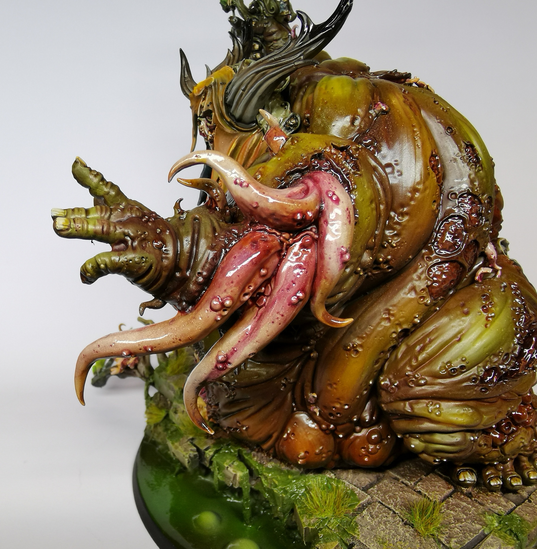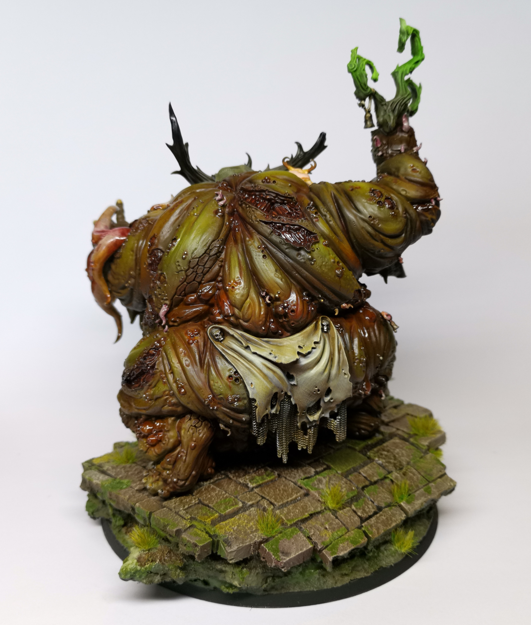Selon l’histoire de ce personnage peut ragoûtant, il fait partie des grandes légions de Démons de Nurgle. À default d’étres belles, ce sont des créatures joyeuses qui vivent comme une grande familles rigolarde sous le regard bienveillant de leur « Grand Père Nurgle », dieux de la pestilence et de la mort, mais aussi de la vie et de la renaissance (sous forme d’asticots, mouches, bactéries etc…). Bref, le genre de copain que l’ont invite pas, même pour un déménagement :).