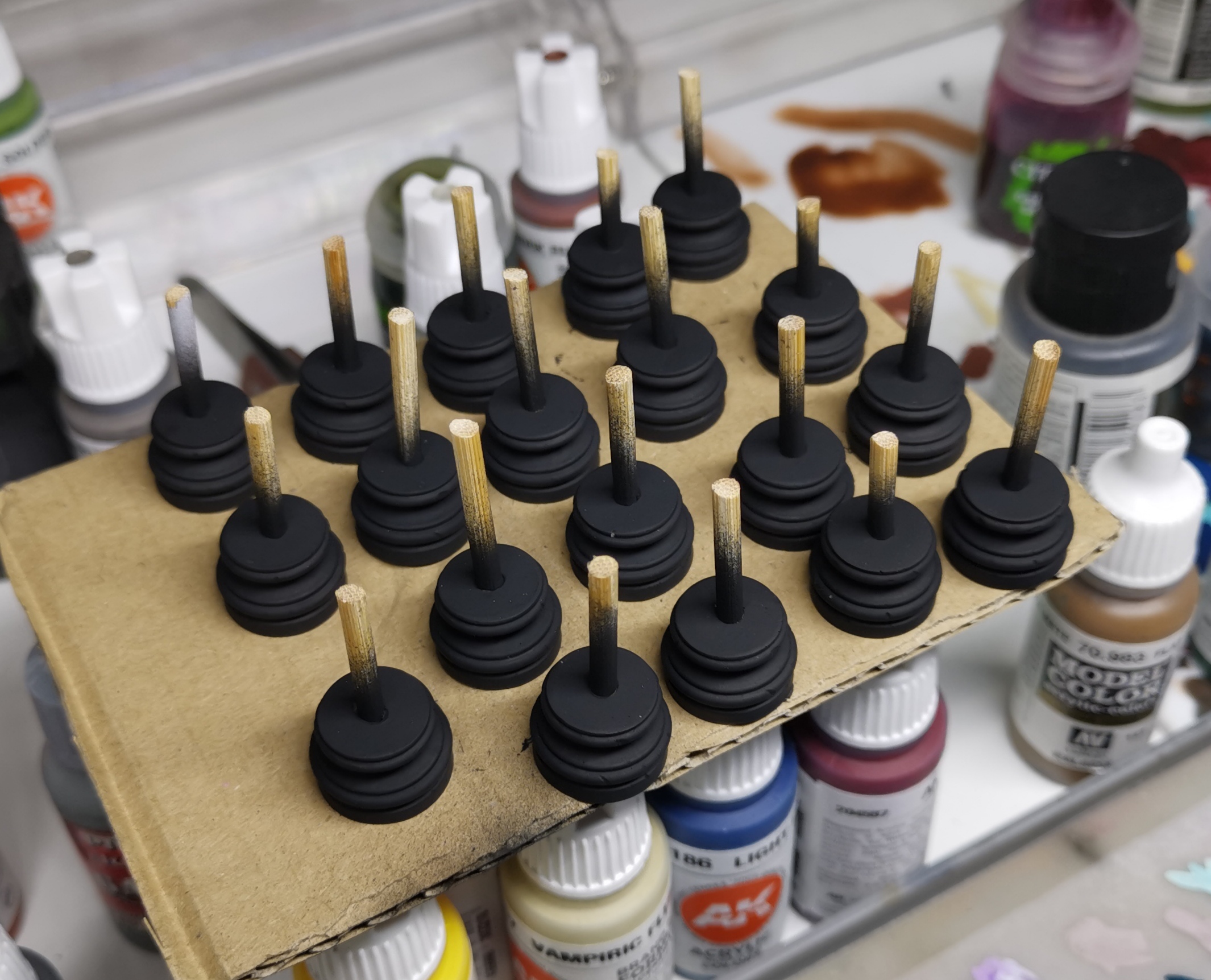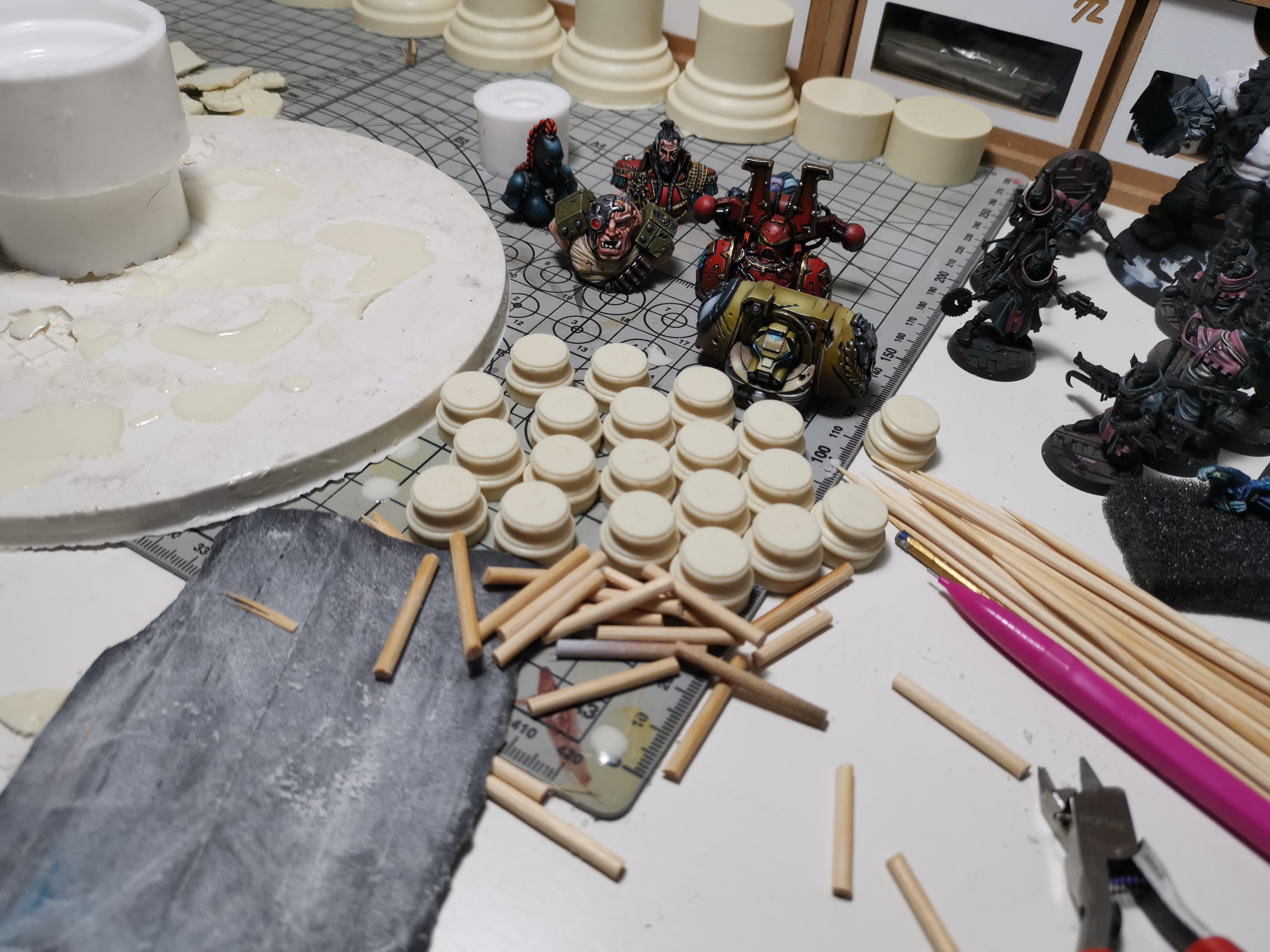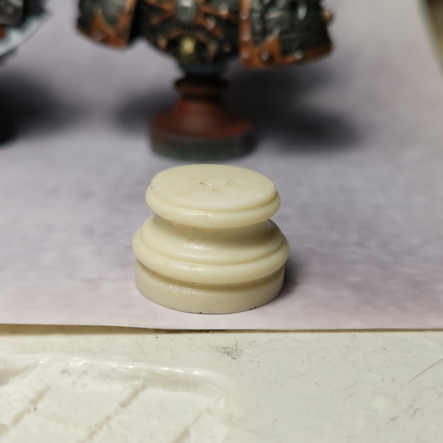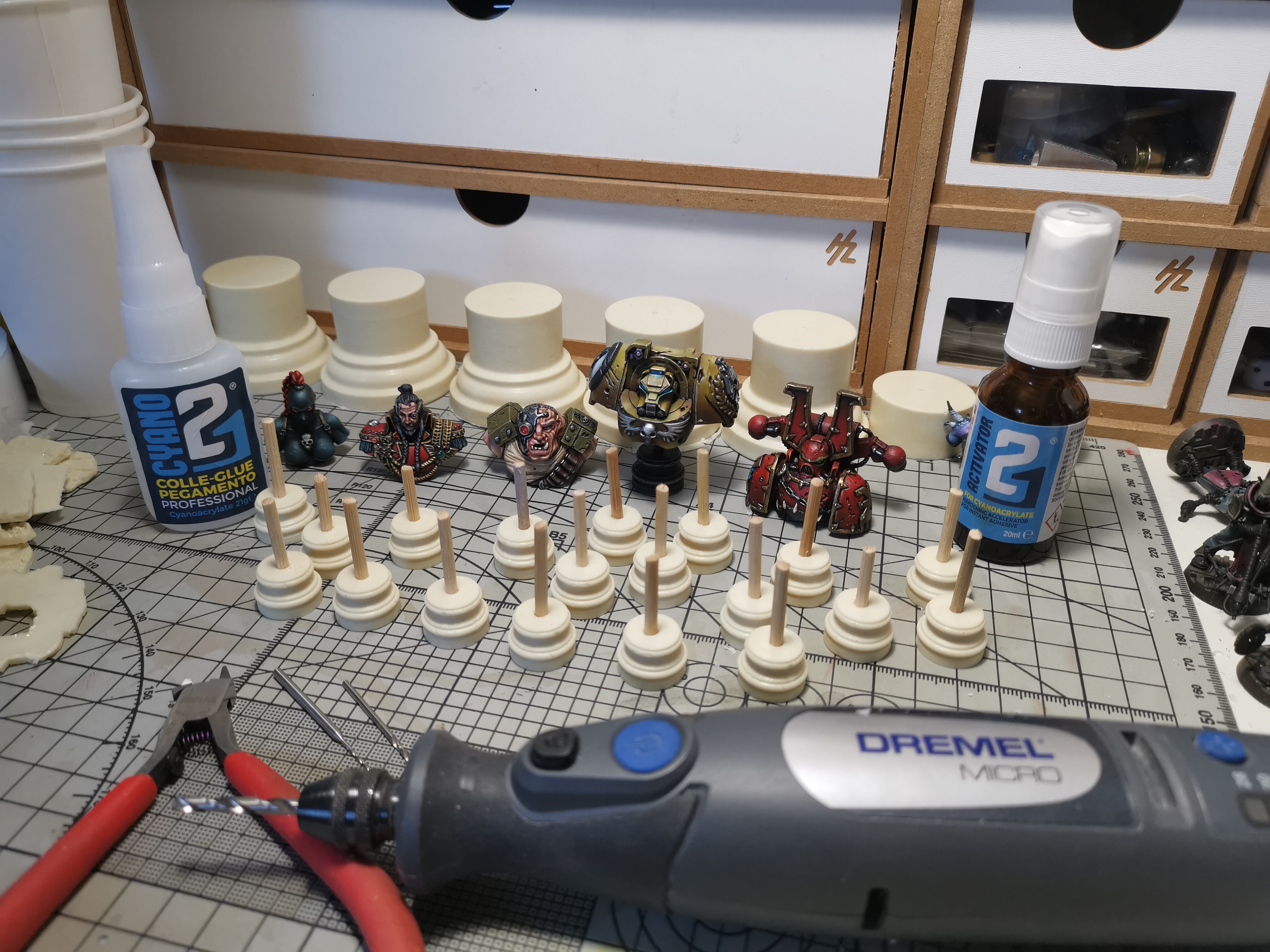 Première constatation, ces pions n’ont pas de socles à proprement parlé (ce sont en fait 5 petits pions tout moches interchangeable). Du coup, en amontdu projet, je décide de préparé des socles customisés. Pour ce faire, je découpe proprement une base de colonne issue de la boite Warcry Catacombe, puis je la moule en 20 exemplaires. Une fois poncé et rincé (eau+savon), je les perce pour y adjoindre de la baguette de 3mm Ø.
