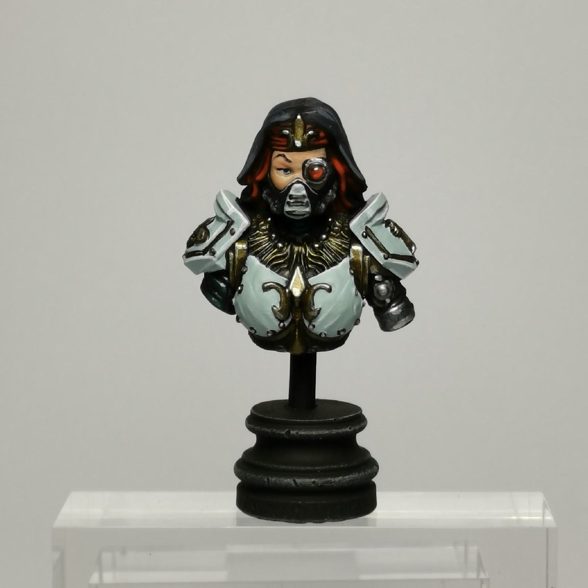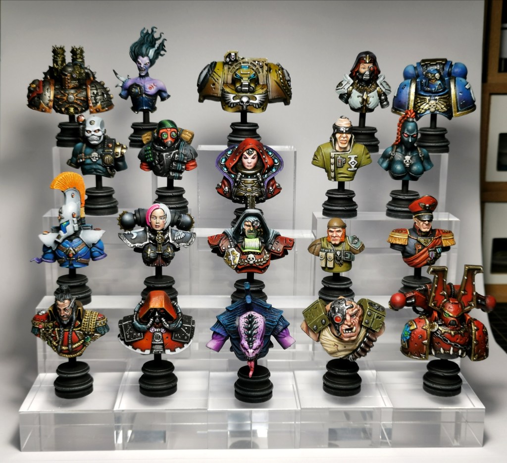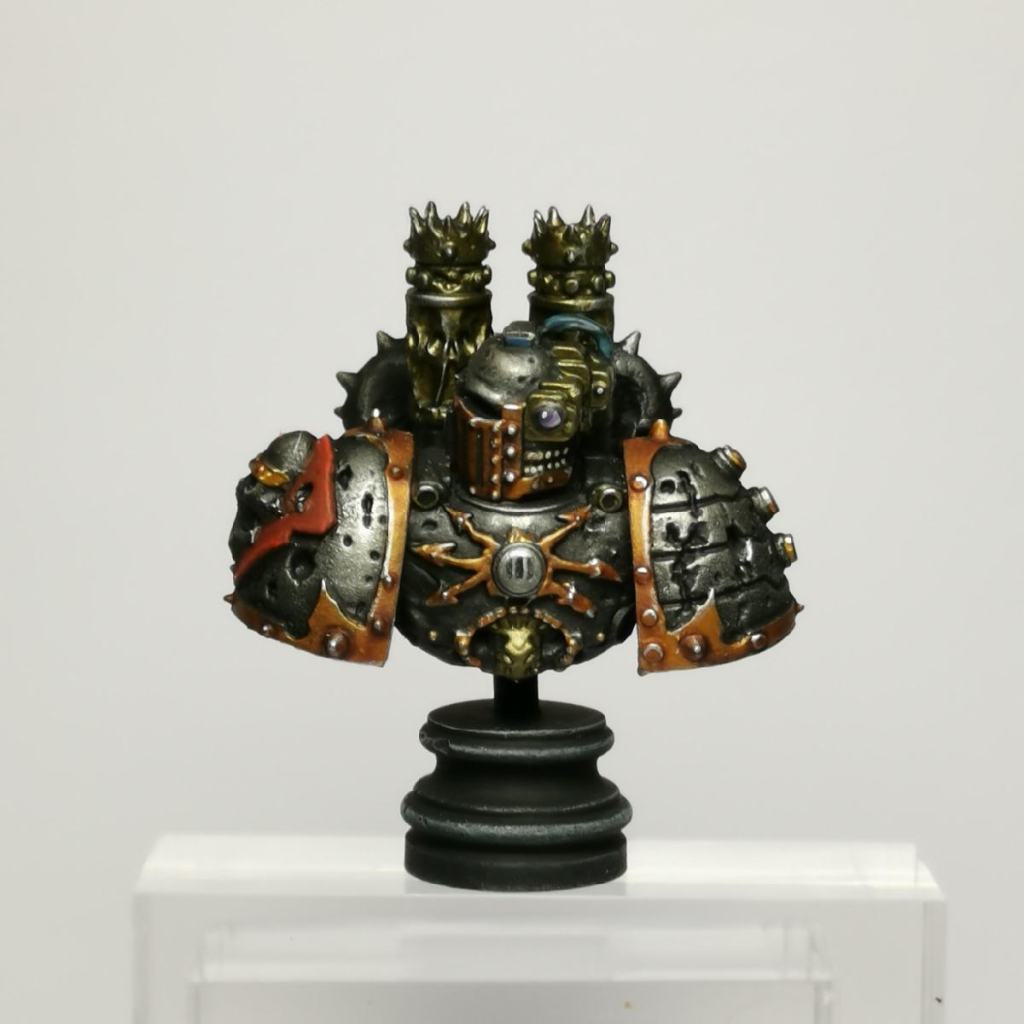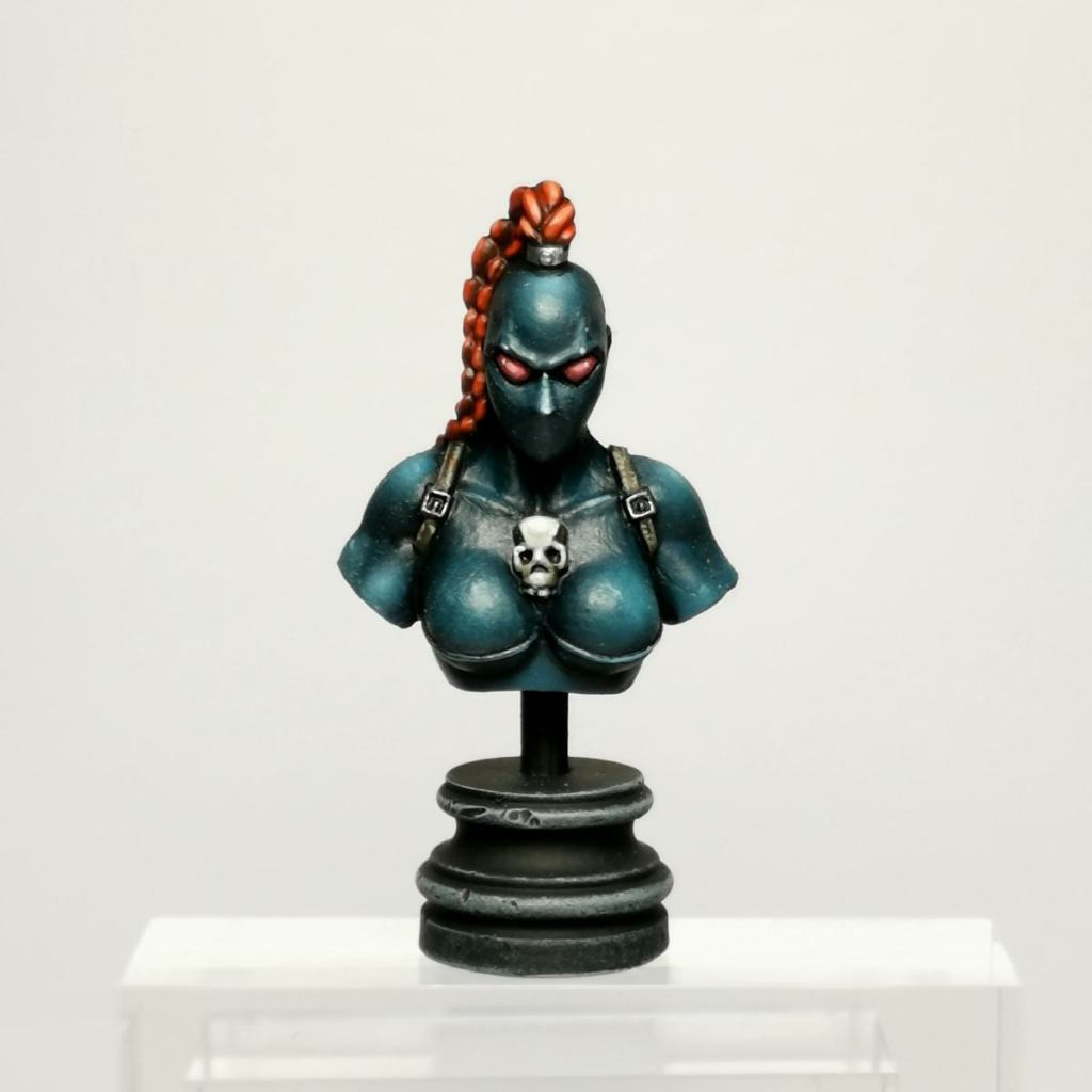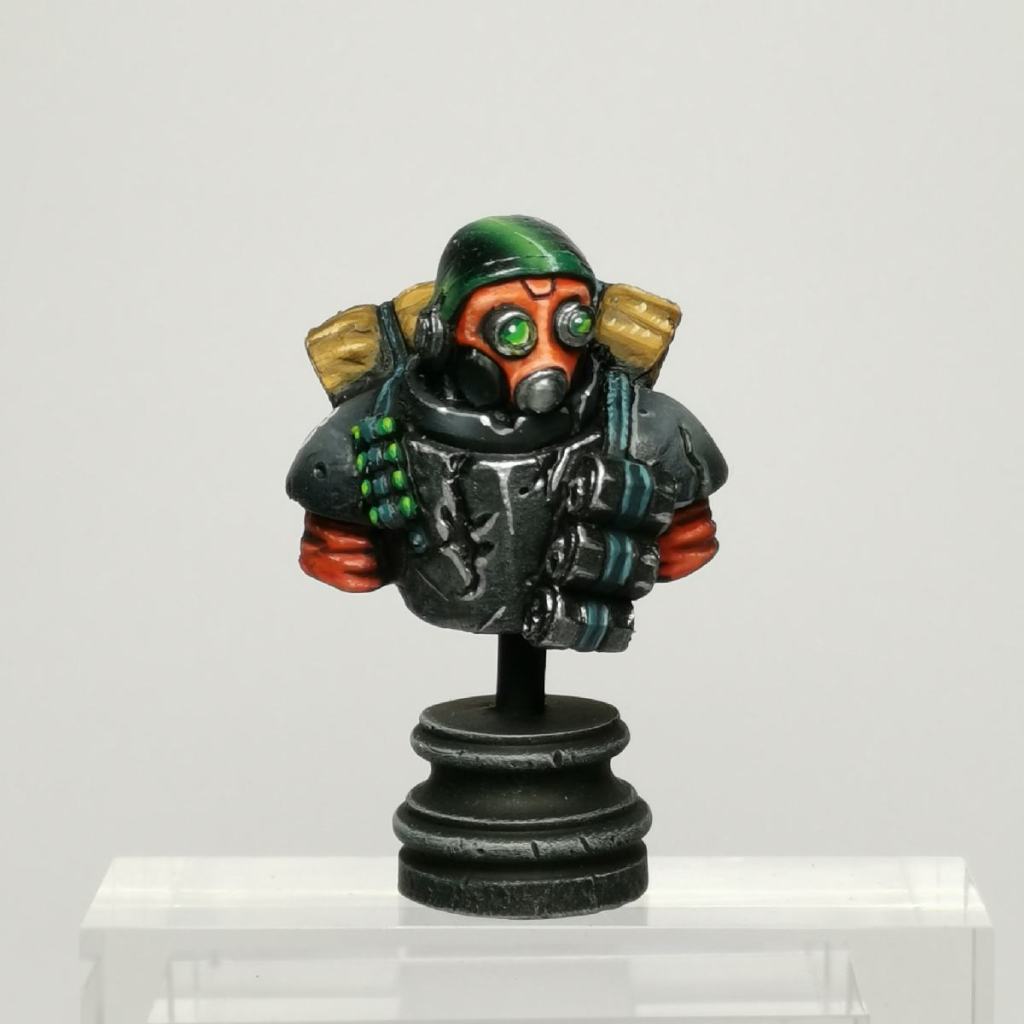 Alors, concernant la peinture. Pas de secret, tout les bustes sont diffèrent. La peinture à la chaine est donc exclue. C’est par un que je me lance dans le projet. Au moins, pas d’ennuis ni de répétitivité. Je pose quelque bases de couleur lors de la sous couche à l’aerographe. Ensuite je passe un jus enamel sur la plupart des détails et intercises et nettoie le surplus au nettoyant. ensuite, détails… Et la c’est l’angoisse 😱. La sculpture est tellement approximative que les arêtes sont quasi inexistantes, les traits grossier et je ne parle même pas de la matière même des bustes qui est impossible à poncé. Voila voila ^^.
