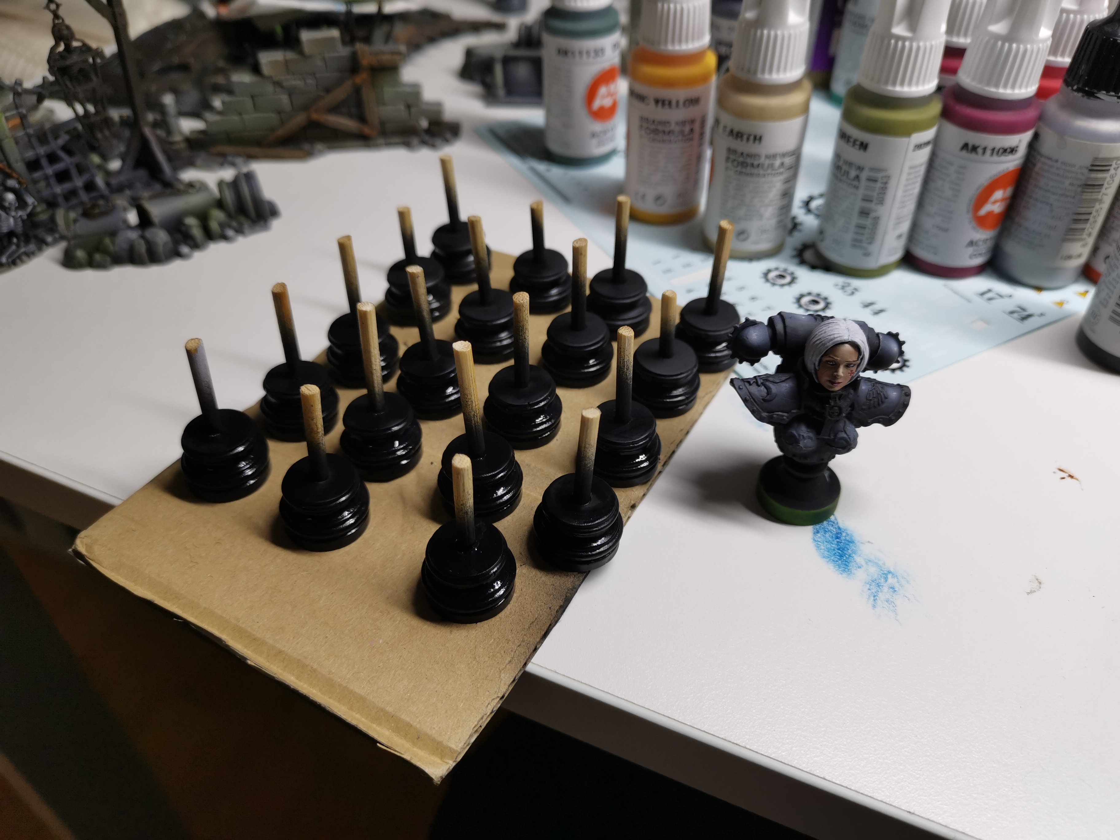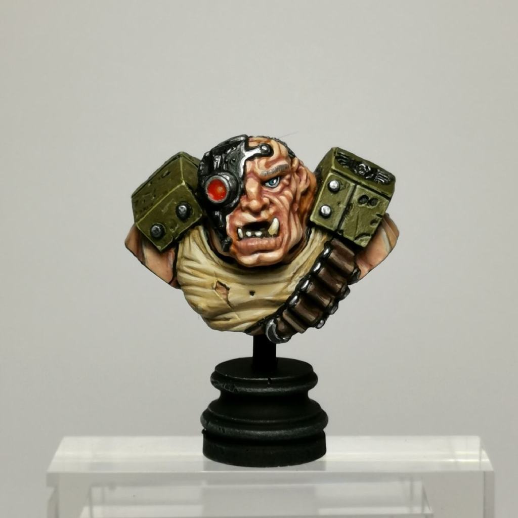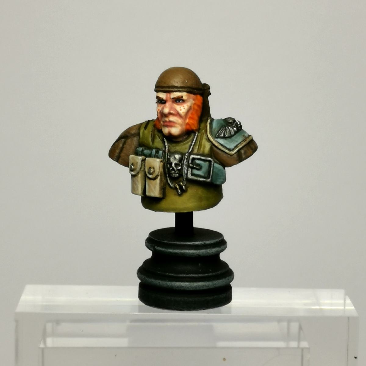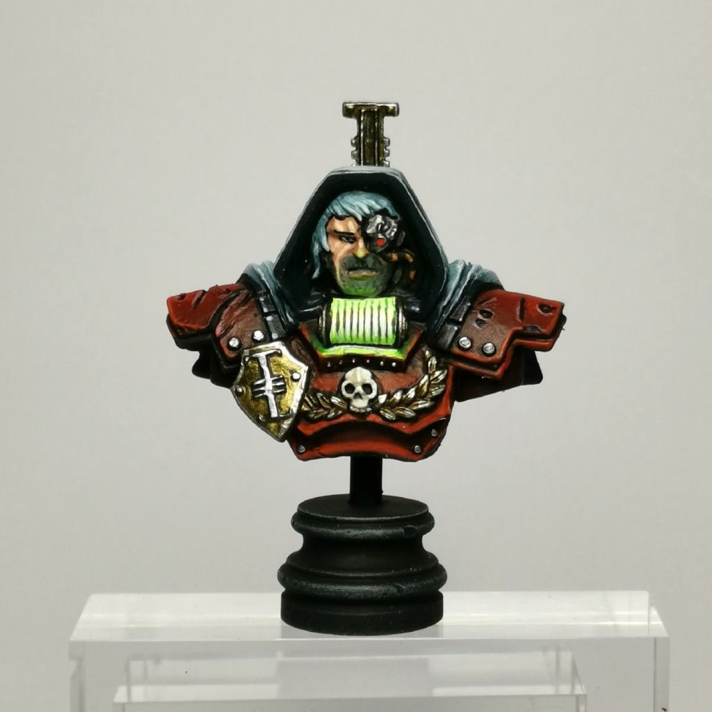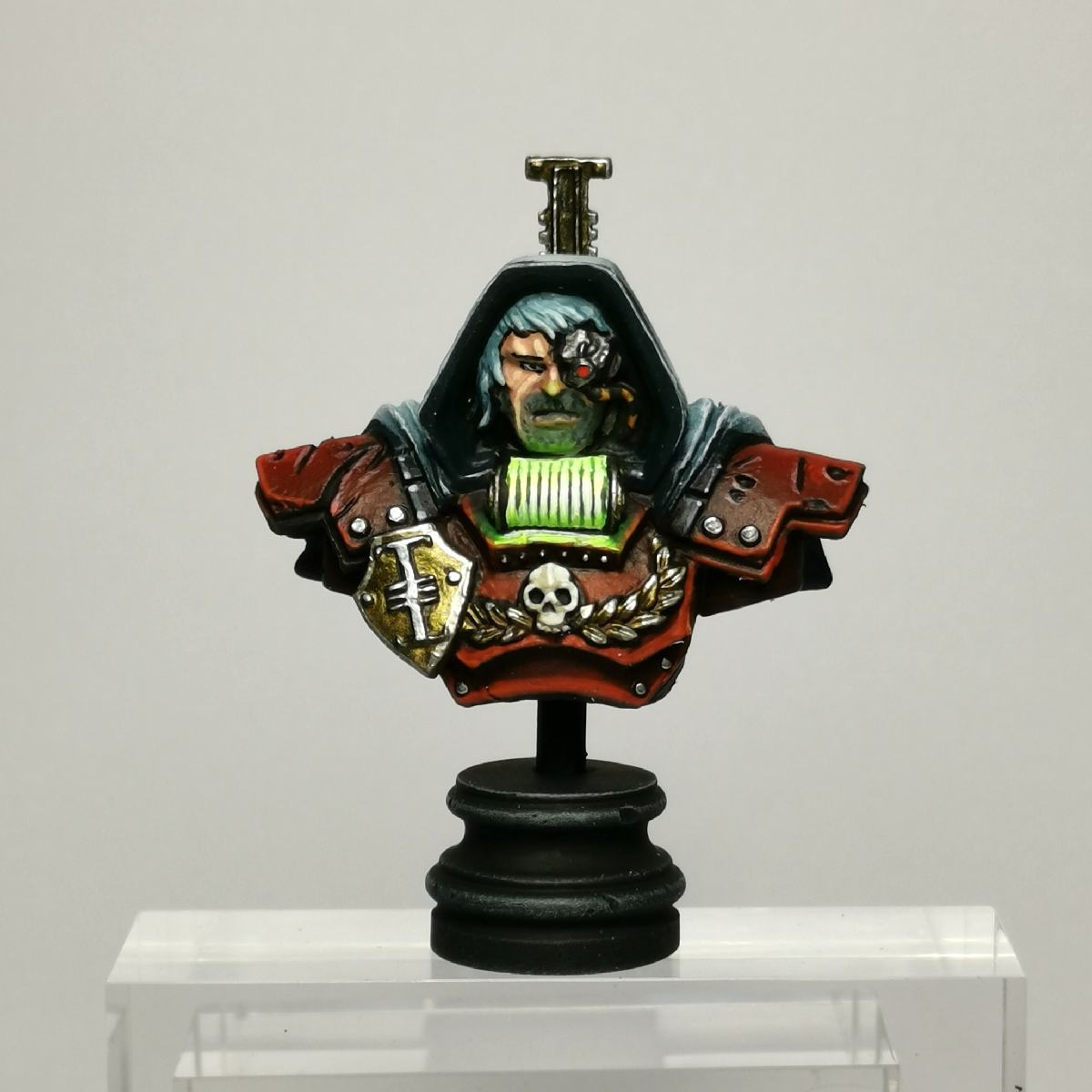 Alors, concernant la peinture. Pas de secret, tout les bustes sont diffèrent. La peinture à la chaine est donc exclue. C’est par un que je me lance dans le projet. Au moins, pas d’ennuis ni de répétitivité. Je pose quelque bases de couleur lors de la sous couche à l’aerographe. Ensuite je passe un jus enamel sur la plupart des détails et intercises et nettoie le surplus au nettoyant. ensuite, détails… Et la c’est l’angoisse 😱. La sculpture est tellement approximative que les arêtes sont quasi inexistantes, les traits grossier et je ne parle même pas de la matière même des bustes qui est impossible à poncé. Voila voila ^^.
